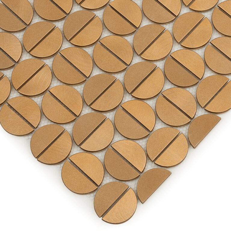 Mozaika ceramiczna z korpusem z aluminium szczotkowanego w kolorze złota w kształcie połówek koła. Idealnie sprawdzi się w stylowych aranżacjach wnętrz, dodając im ekskluzywnego charakteru. Złoty, szczotkowany efekt nadaje powierzchni elegancji, a metaliczny połysk wprowadza subtelny akcent nowoczesności