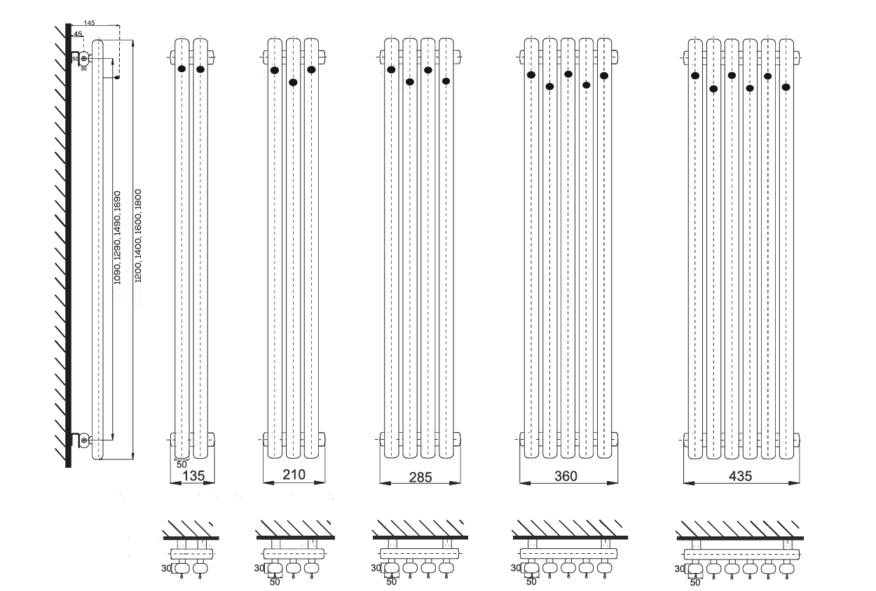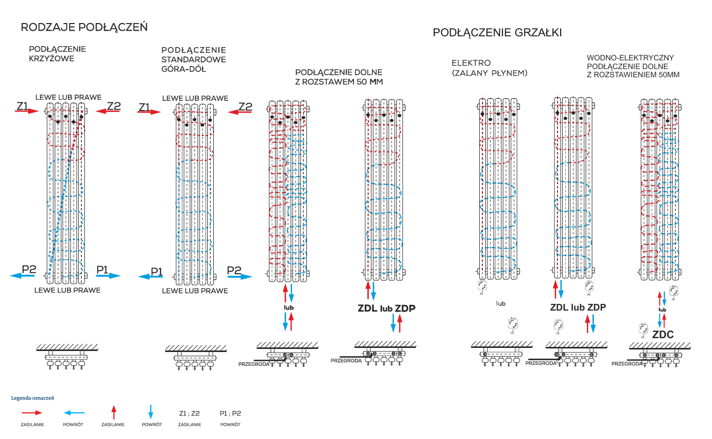 – standardowym podłączeniem jest podłączenie boczne. Istnieje możliwość wykonania podłączenia od dołu z rozstawem 50 mm (zasilanie dolne centralne, prawe lub lewe)