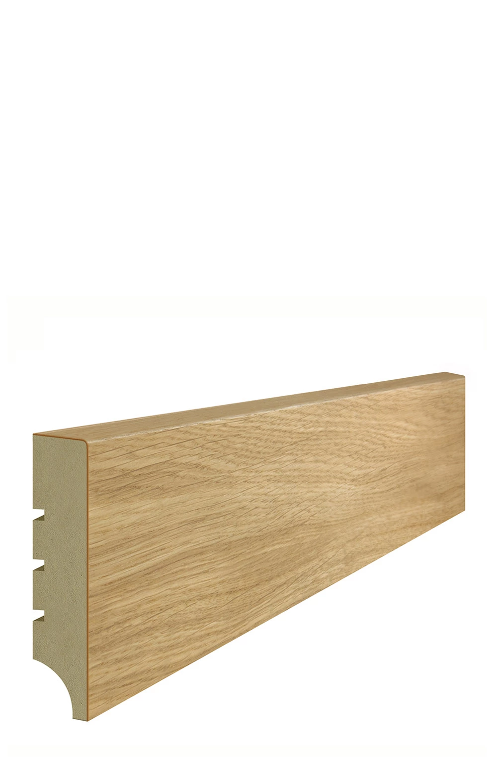 Listwa przypodłogowa CLASSIC R1 wykonana z wilgocioodpornego MDF, wykończona fornirem z naturalnego dębu w surowym stanie. Charakteryzuje się eleganckim, klasycznym profilem, który doskonale komponuje się z podłogami drewnianymi i nowoczesnymi wnętrzami. Surowa powierzchnia pozwala na indywidualne wykończenie i dopasowanie koloru do aranżacji pomieszczenia.