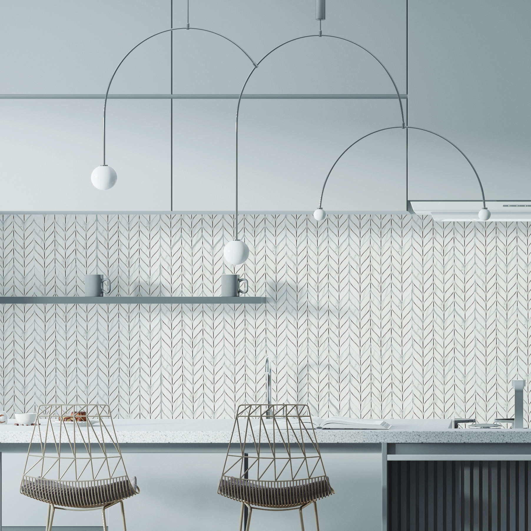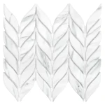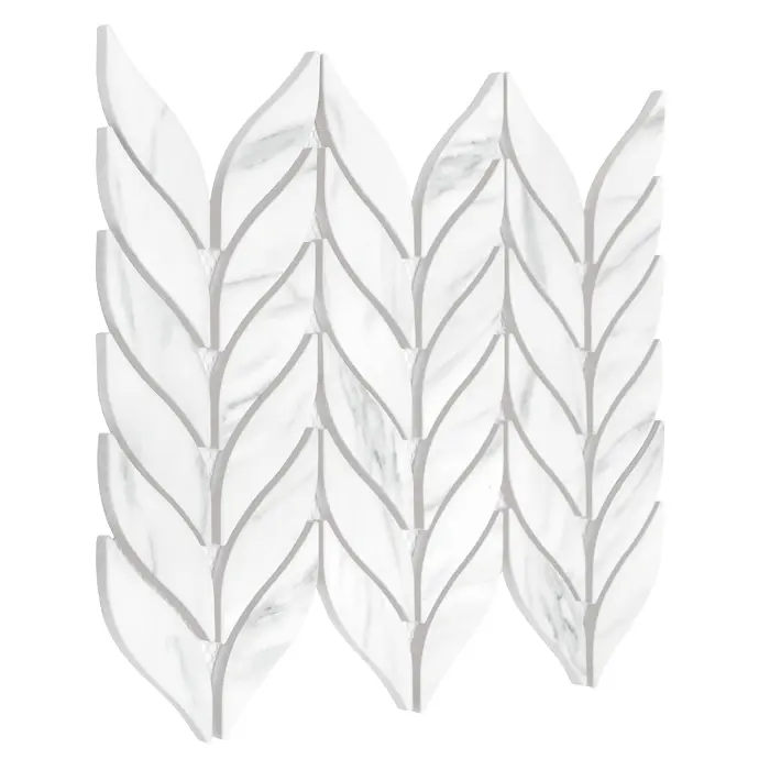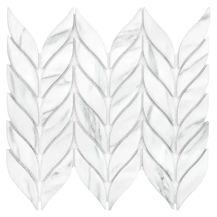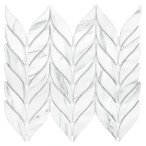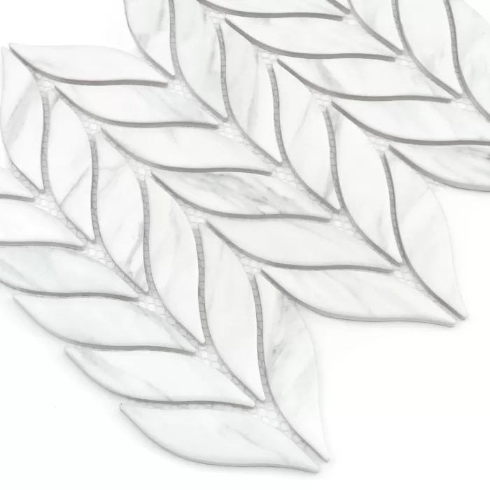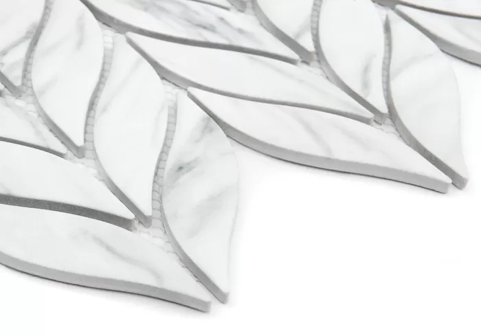 Mozaika w stylu roślinnym inspirowana kłosami żyta, wykonana z gresu o wysokiej trwałości. Płytki o matowej powierzchni z realistycznym wzorem marmuru Carrara, z efektem spękania i subtelnego cieniowania, przyklejone na siatkę z włókna szklanego.
