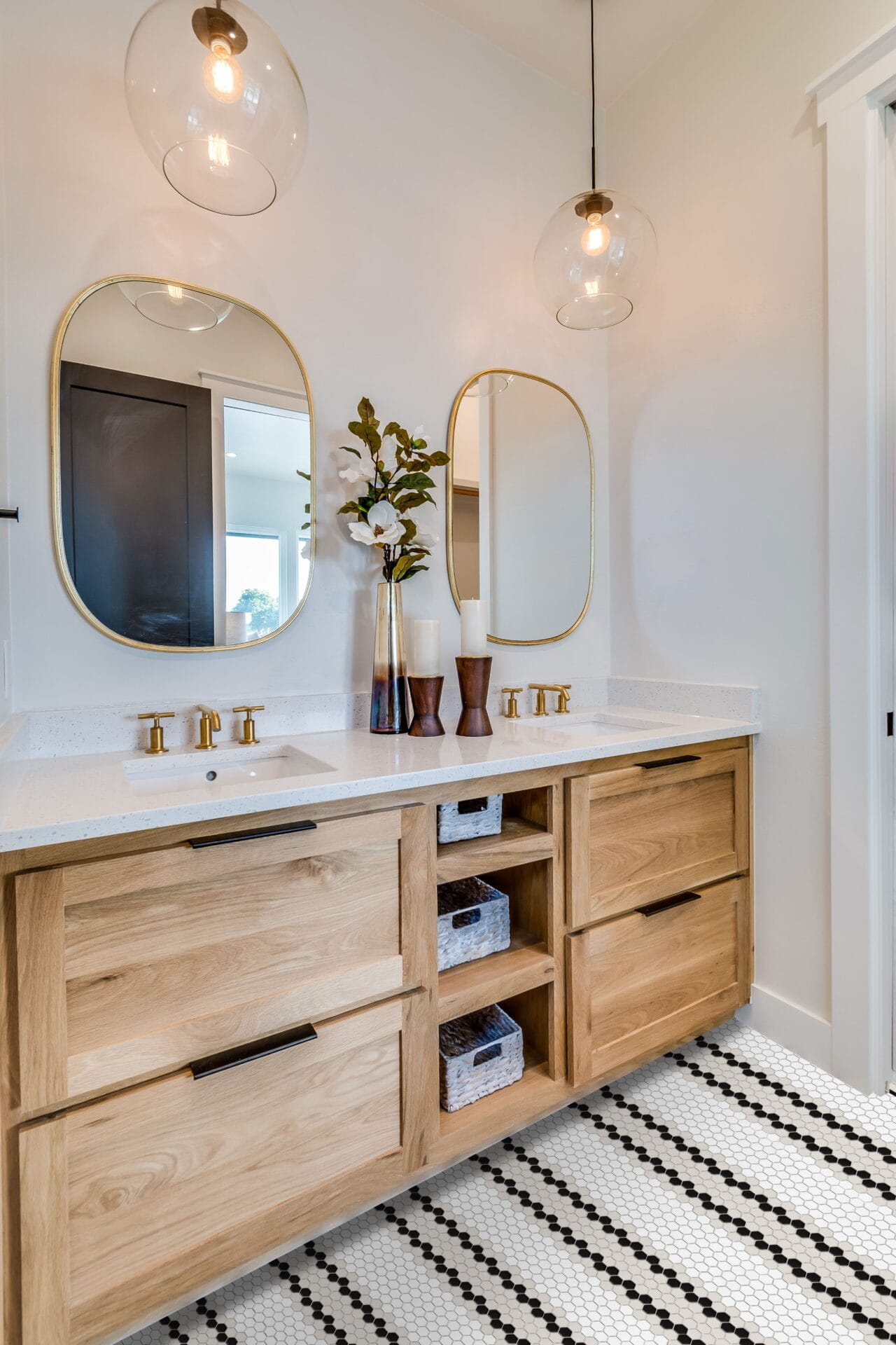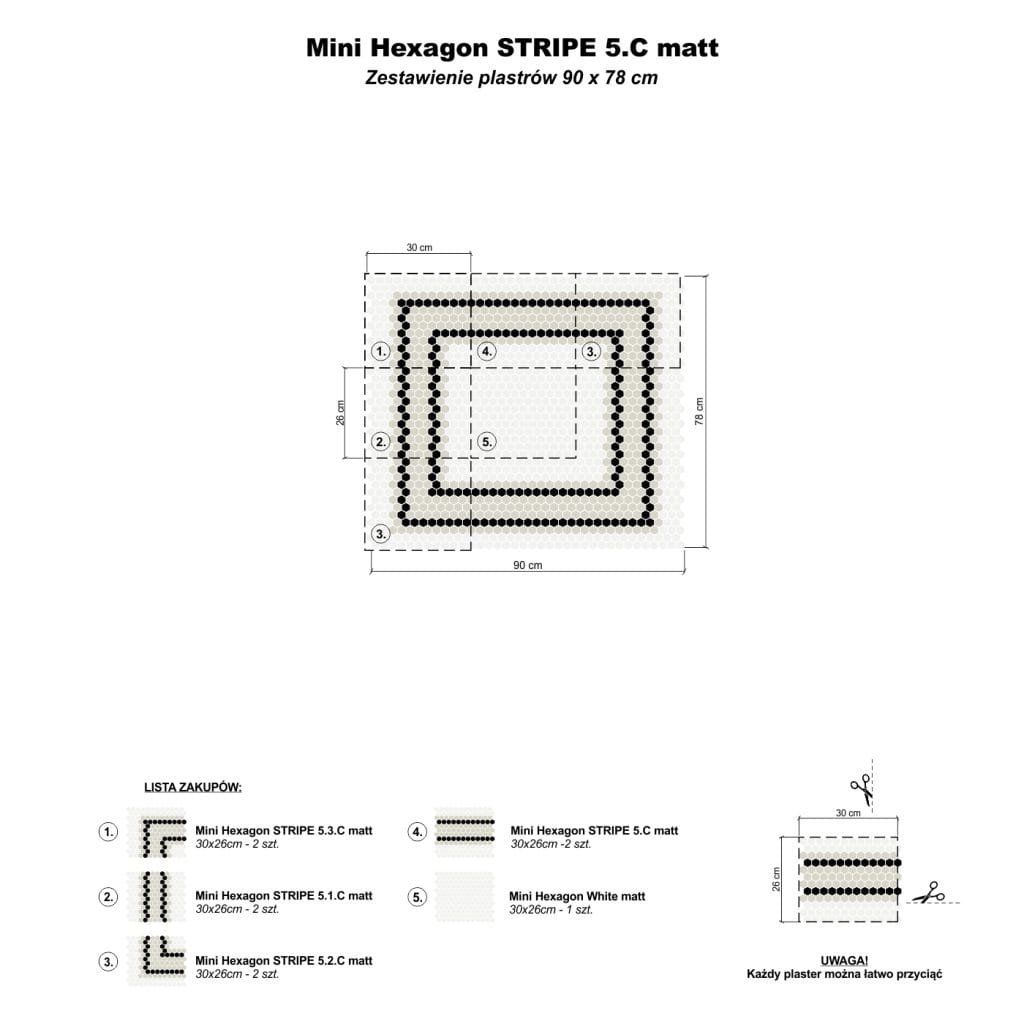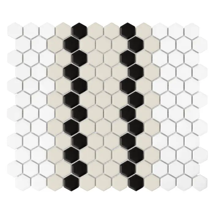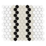 Mini Hexagon Stripe 5.1.C matt-to mozaika w połączeniu białej bazy z szerokim beżowym pasem przedzielonym podwójną czarną linią, tworząc kompozycję prostokątów. Wzór w orientacji pionowej, zaprojektowany przez House Loves, idealny na podłogi i ściany. Łatwy w utrzymaniu, odporny na zarysowania, z możliwością personalizacji wzorów.