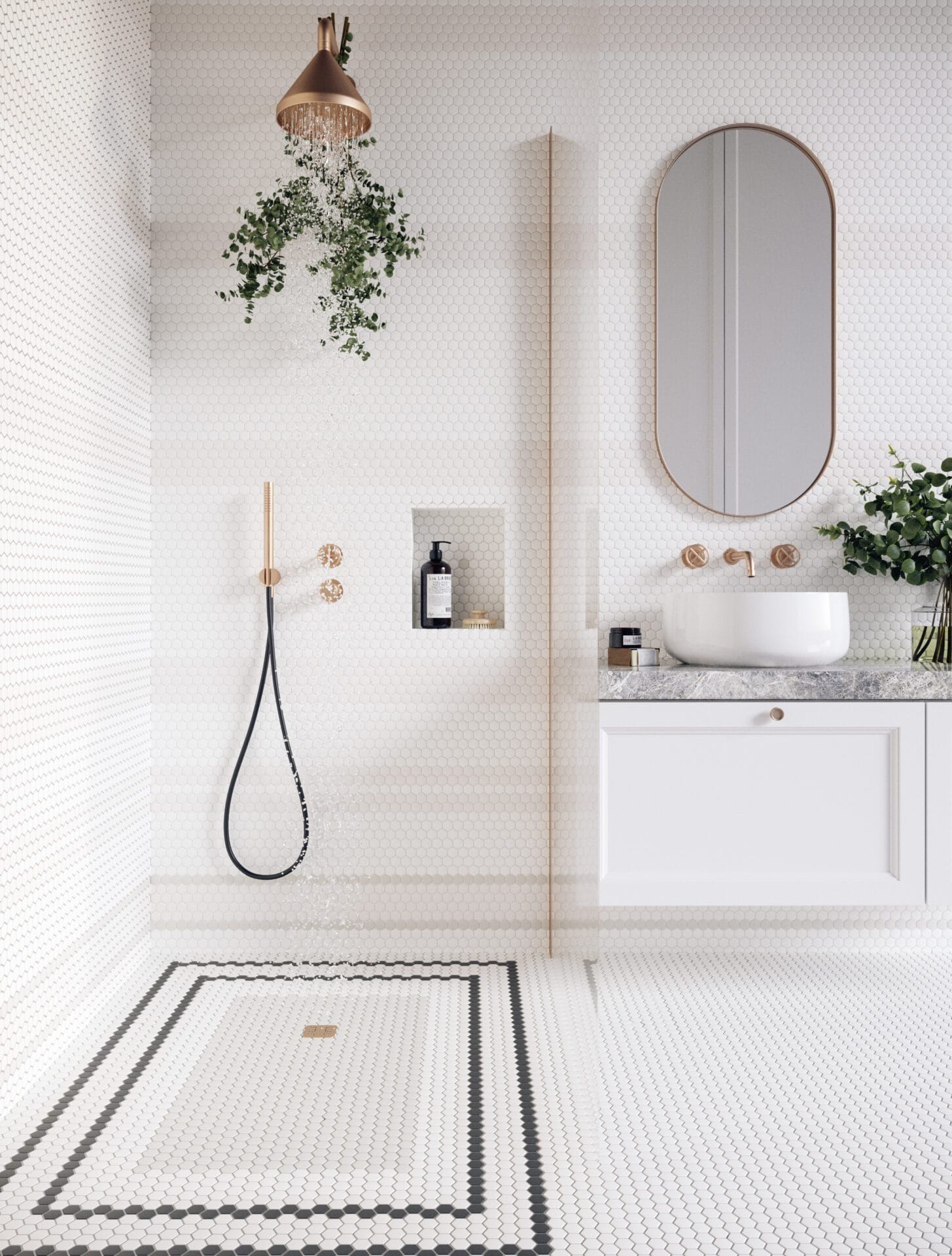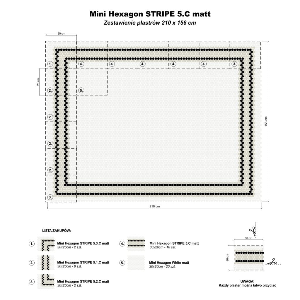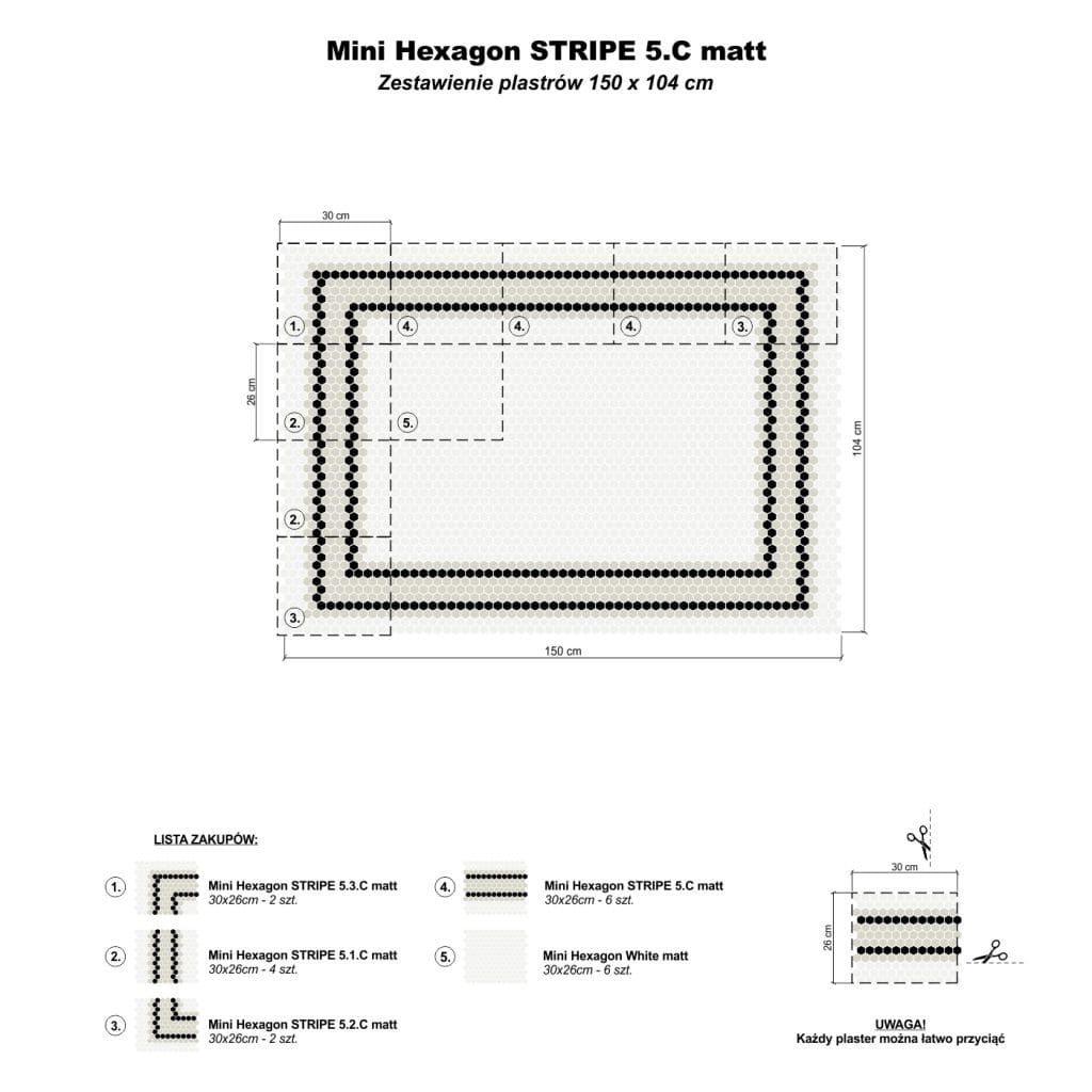 Mini Hexagon Stripe 5.3.C matt-to mozaika z białą bazą i szerokim beżowym pasem przedzielonym podwójną czarną linią, tworzącą kompozycje prostokątów w kształcie odwróconej litery „L”. Zaprojektowana przez House Loves, idealna na podłogi i ściany. Łatwa w utrzymaniu, odporna na zarysowania, z możliwością personalizacji wzorów.
