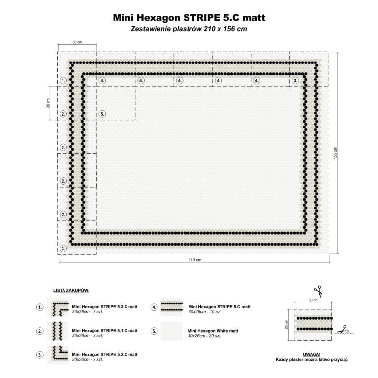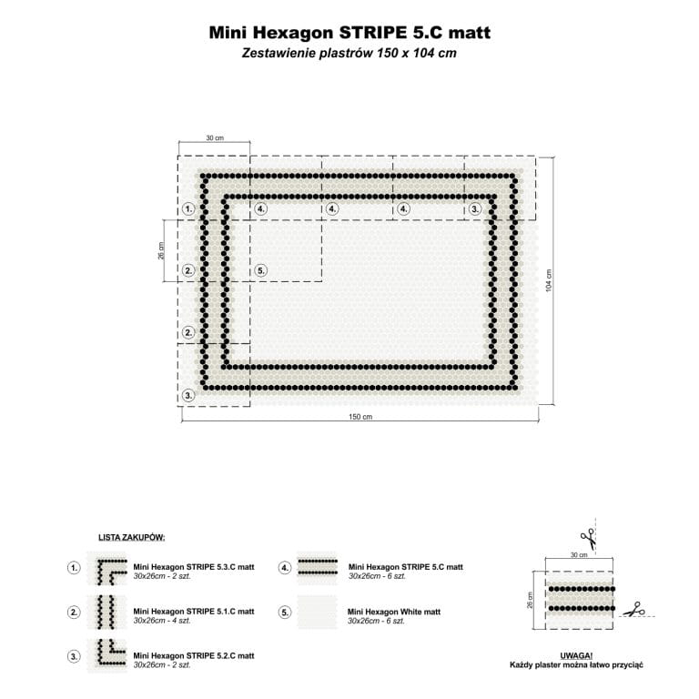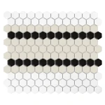 Mini Hexagon Stripe 5.C matt-to elegancka mozaika w połączeniu białej bazy z szerokim beżowym pasem przedzielonym podwójną czarną linią, tworząc prostokątne kompozycje. Zaprojektowana przez House Loves, idealna na podłogi i ściany w różnych pomieszczeniach. Łatwa w utrzymaniu, odporna na zarysowania, z możliwością personalizacji wzorów, dopasowując je do indywidualnych potrzeb.