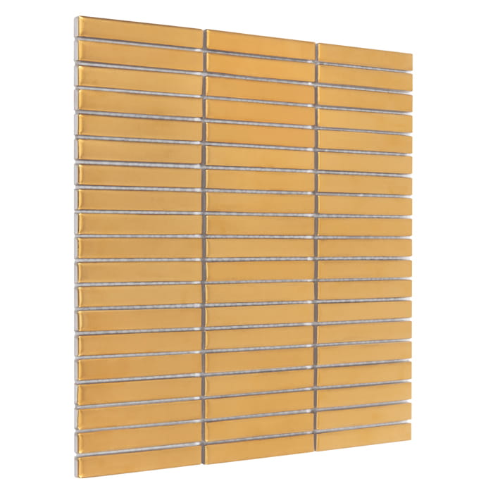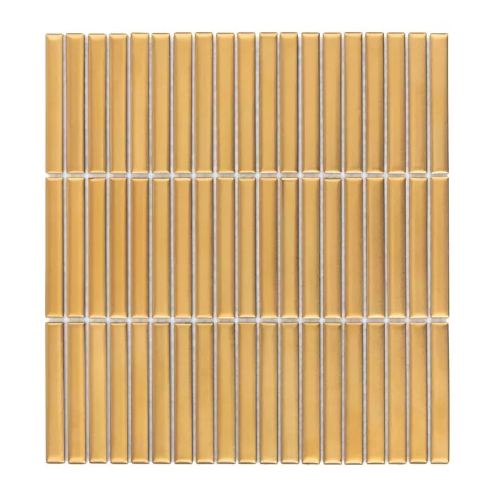 Złota mozaika typu finger stick, łączy w sobie ponadczasowy urok prostokątnego kształtu z nowoczesnym designem. Charakteryzuje się pięknym, złotym odcieniem i subtelnym matowym połyskiem, który nadaje jej elegancki i wyrafinowany wygląd. Mozaika stanowi subtelny, ale efektowny akcent dekoracyjny. Jej elegancki wygląd sprawia, że doskonale stanowi całość w klasycznych, jak i luksusowych przestrzeniach, dodając im ciepło i styl.