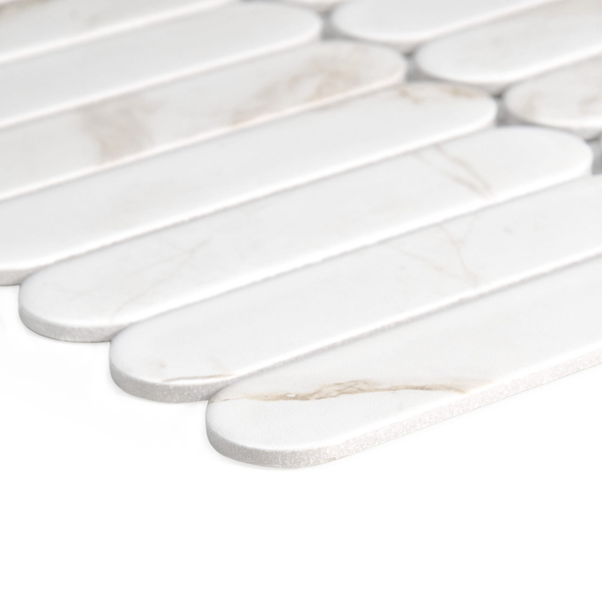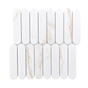 Elegancka płytka gresowa w kształcie biszkoptów z subtelnym złocisto-beżowym żyłkowaniem inspirowanym marmurem Calacatta. Luksusowy akcent do kuchni i łazienki.