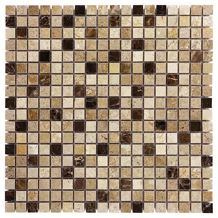 Travertine Cream Mix 15 to wyjątkowa kompozycja beżowych kwadratów o średnicy 15 mm, w różnych odcieniach, pochodząca z serii Travertine & Emperador. Mozaika jest wykonana z naturalnych kamieni – trawertynu i marmuru, charakteryzujących się polerowaną powierzchnią, która podkreśla unikalne wzory i fakturę kamienia. Seria wyróżnia się prostą, ale bogatą estetyką, a jej naturalne, głębokie wzory doskonale pasują zarówno na ściany, jak i podłogi, wprowadzając do wnętrz elegancki, ponadczasowy akcent.