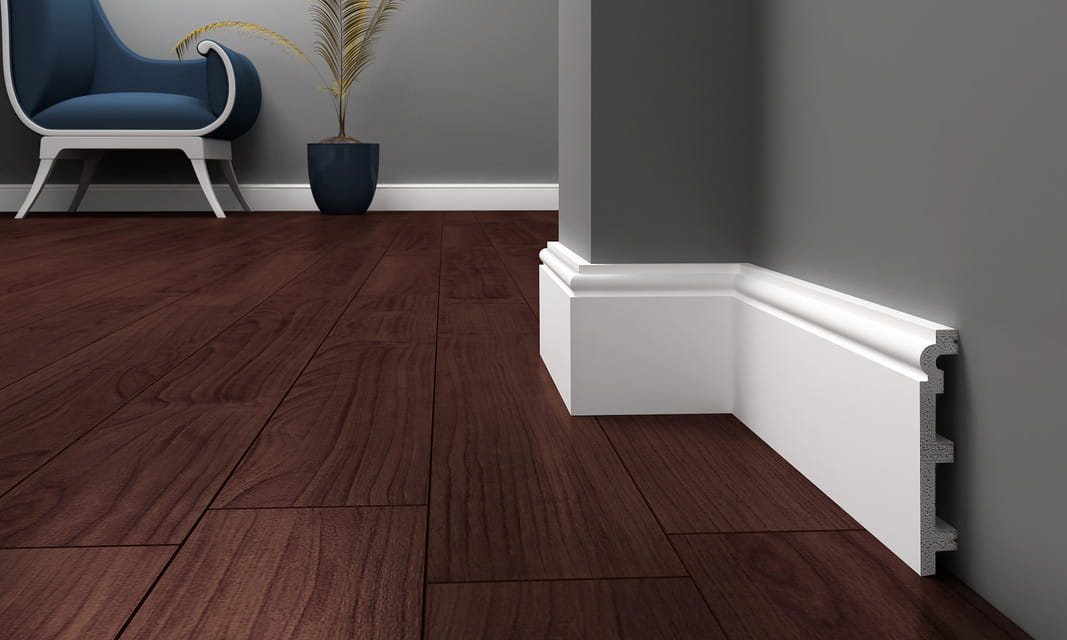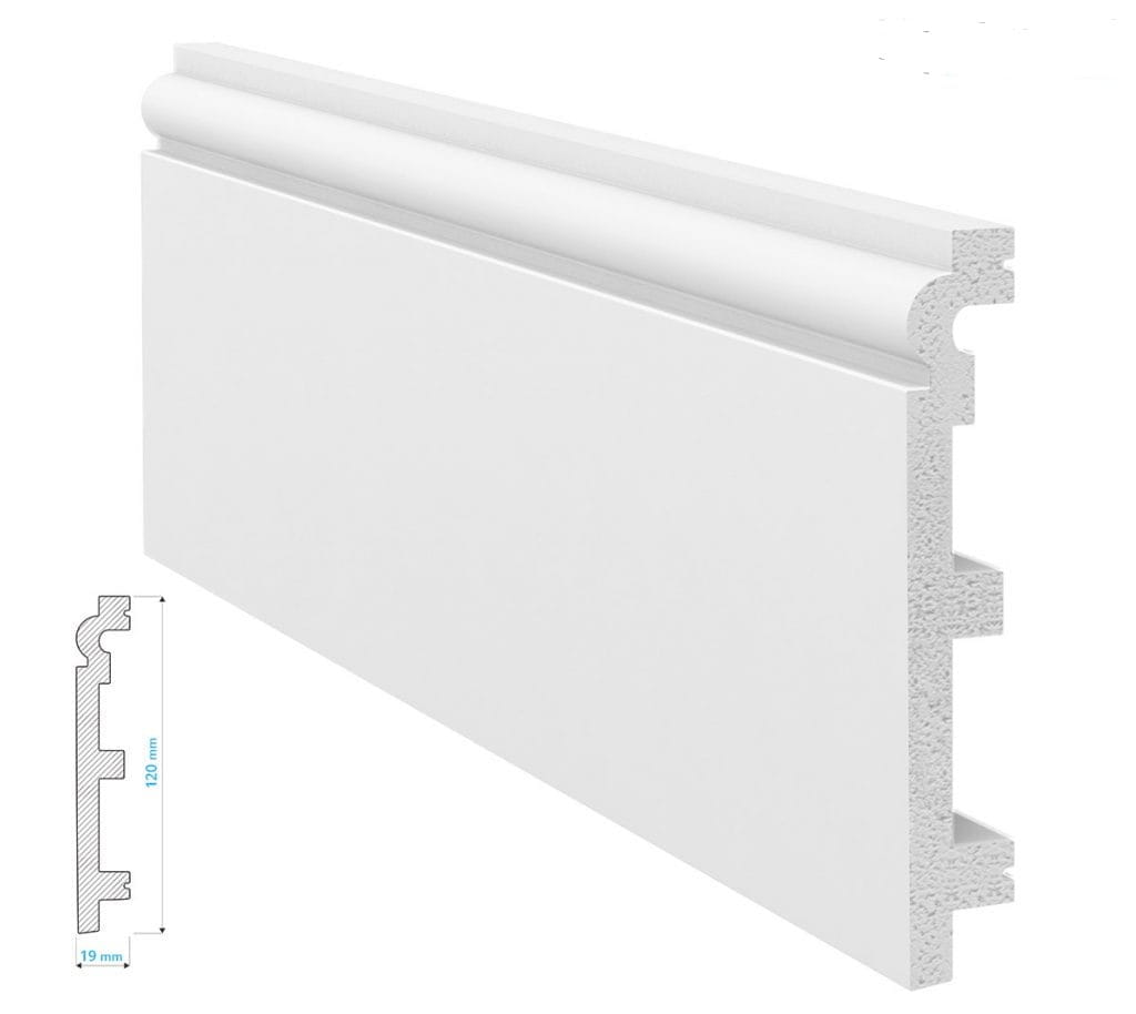 Listwa przypodłogowa P12019 marki KROME ma wyjątkowo estetyczny i elegancki profil. Jej wysokość to aż 12 cm, co jest idealnym rozwiązaniem w wysokich pomieszczeniach. Dodatkowo jej długość to 240 cm, więc jest idealna do dużych i długich pomieszczeń, choć można ją dowolnie skrócić we własnym zakresie. Jej przekrój to aż 19 mm grubości, co sprawia, że jest idealna do ukrycia dylatacji.